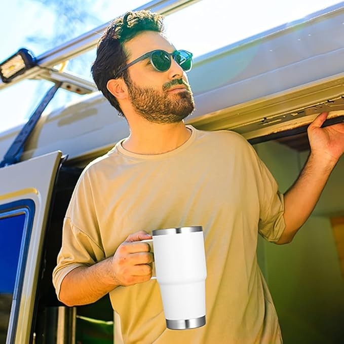 Colored Powder Coated Tumbler: The stainless steel coffee mug is crafted with stylish color powder coating, gives you multiple color options. It's cool to touch when filling with hot water and also sweat proof with cold water, always keep your hands comfortable while holding the coffee travel mug with handle